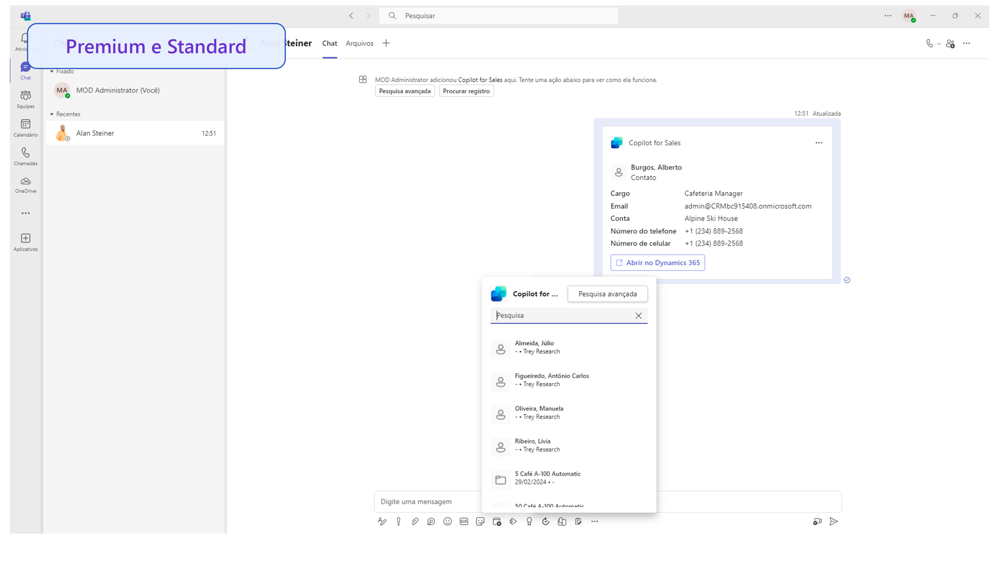 Você pode atualizar rapidamente sua equipe de vendas compartilhando dados de CRM em chats e canais do Teams.