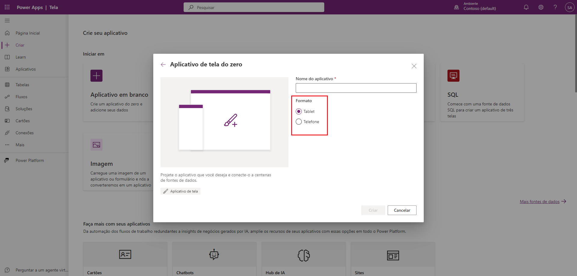 Após conclusão do planejamento, acesse a página inicial do Power Apps, selecione Criar e escolha Começar com uma tela em branco. O Microsoft Power Apps solicita que você selecione uma opção de Formato antes que o aplicativo seja criado. Esta é a primeira oportunidade de selecionar um fator forma, como telefone, tablet ou layout dinâmico, que se alinhe com a experiência em dispositivo móvel pretendida para seu aplicativo.