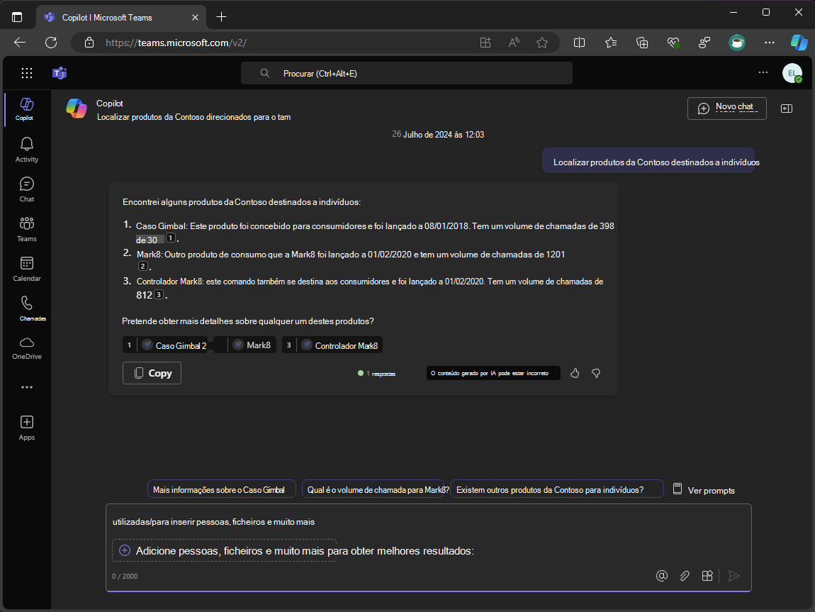 Funciona com Microsoft 365 Copilot como um plug-in, permitindo-lhe consultar os dados do produto em nome do utilizador e utilizar os dados devolvidos nas respostas.