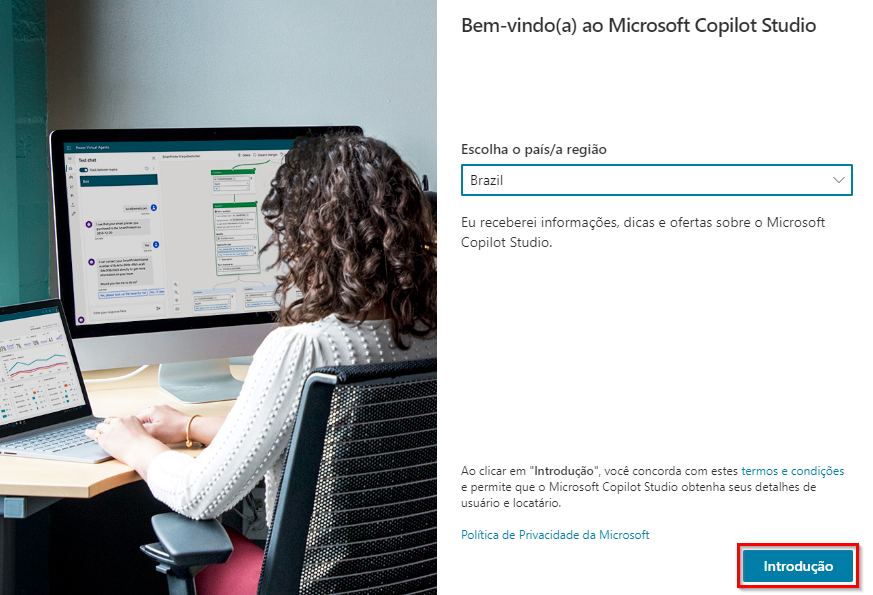No pop-up Bem-vindo ao Copilot Studio, deixe o país/região como o valor padrão e selecione Iniciar avaliação gratuita.