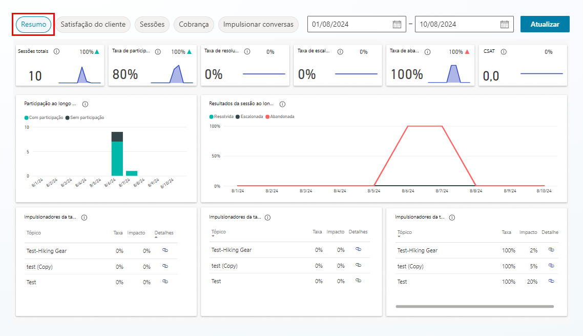 Os visuais adicionais no Resumo incluem gráficos que comparam os resultados da Participação ao longo do tempo e da Sessão ao longo do tempo, bem como tabelas detalhando o impacto e os impulsionadores de taxa de Resolução, Escalonamento e Abandono para cada tópico acionado.