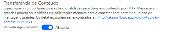 Ao lidar com mensagens, o tempo de execução do conector limita o conteúdo da mensagem a um tamanho máximo. Esse limite ajuda a reduzir a sobrecarga criada pelo armazenamento e processamento de mensagens grandes. Para ajudar a lidar com mensagens maiores do que esse limite, os conectores podem fragmentar uma mensagem grande em partes de mensagem menores. Assim, você ainda pode transferir conteúdo grande. Ao se comunicar com outros serviços por meio de conectores, o tempo de execução pode consumir mensagens grandes, mas apenas em partes. Essa condição significa que os conectores também devem dar suporte a agrupamento e à troca de mensagens HTTP subjacente entre o conector e esses serviços deve usar agrupamento.