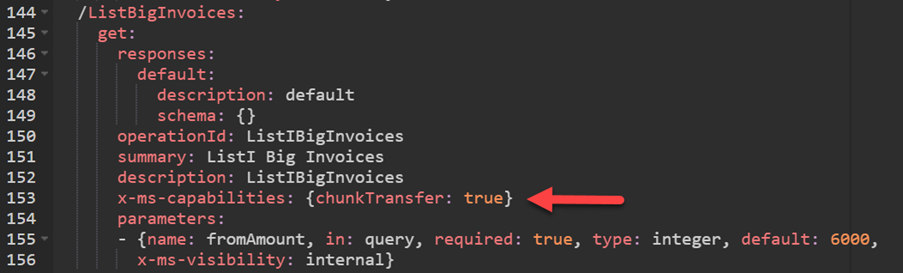 Na definição de conector personalizado, você adicionaria a lógica a seguir à definição de operações para a qual deseja habilitar a transferência de partes.