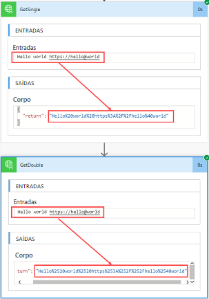 Quando você executa um fluxo do Microsoft Power Automate que chama ambas as ações com uma entrada complexa, a codificação dupla passa o mesmo valor de texto para a API, exceto que agora ele é codificado duas vezes.
