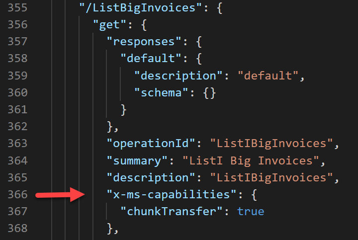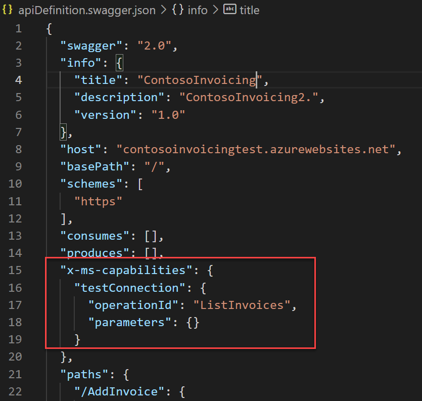 A edição de apiDefinition.swagger.json seria semelhante à imagem a seguir.