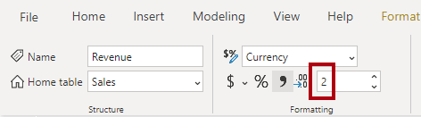 Imediatamente depois de criar uma medida, defina as opções de formatação para garantir valores bem apresentados e consistentes em todos os elementos visuais do relatório.
