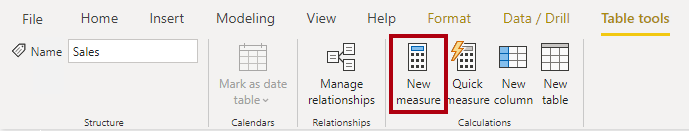 No exemplo seguinte, irá adicionar uma medida à tabela Vendas . No painel Campos , selecione a tabela Vendas . Para criar uma medida, no friso contextual Ferramentas de Tabela, no grupo Cálculos, selecione Nova medida.