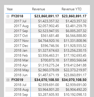 Por exemplo, na empresa Adventure Works, o ano financeiro começa a 1 de julho e termina a 30 de junho do ano seguinte. A empresa produz um elemento visual de tabela que apresenta a receita mensal e a receita do ano até à data (YTD).