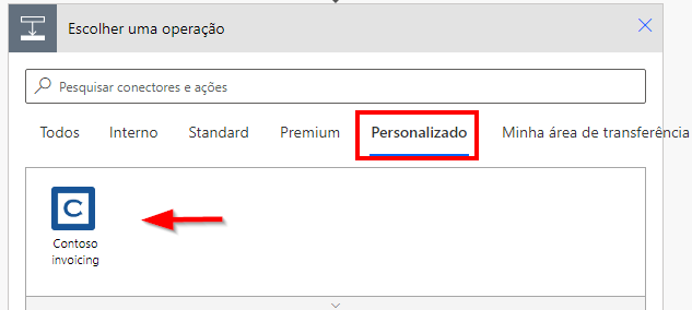 Os conectores personalizados podem ser usados pelo Power Apps, Power Automate e Aplicativos Lógicos do Azure. Depois de selecionar um conector personalizado, usá-lo não é diferente de usar um conector interno. Para usar o conector personalizado com o Power Apps e o Power Automate, você deve configurá-lo ou implantá-lo no mesmo ambiente em que está criando seus aplicativos e fluxos. Se você sabe que ele é um conector personalizado, a maneira mais rápida de adicionar gatilhos ou ações a partir dele é selecionando a guia Personalizado, pois ela mostrará somente os conectores personalizados no ambiente. No ambiente, você pode selecionar gatilhos e ações como um conector interno.
