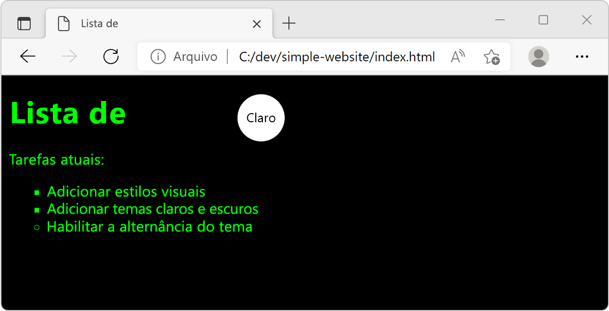 Imagine que você é um desenvolvedor web e foi solicitado a tornar o site da sua empresa atraente para uma gama mais ampla de clientes. Para permitir que seus clientes personalizem a experiência deles em seu site, você decide adicionar suporte para temas claros e escuros. Você cria um site pequeno e de prova de conceito para demonstrar suporte a temas usando CSS e escreve uma função JavaScript para alternar entre esses temas.