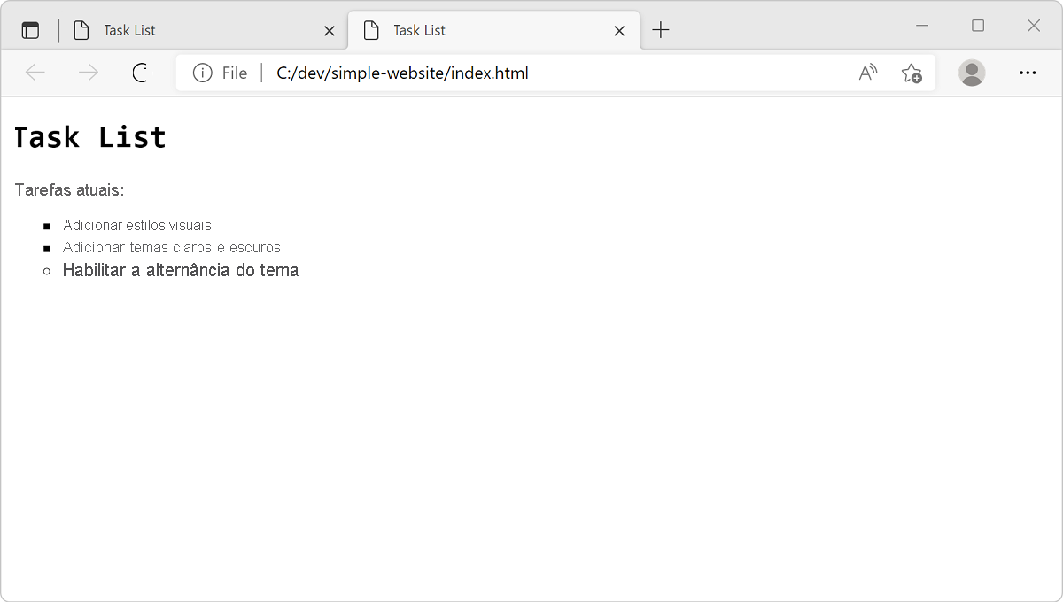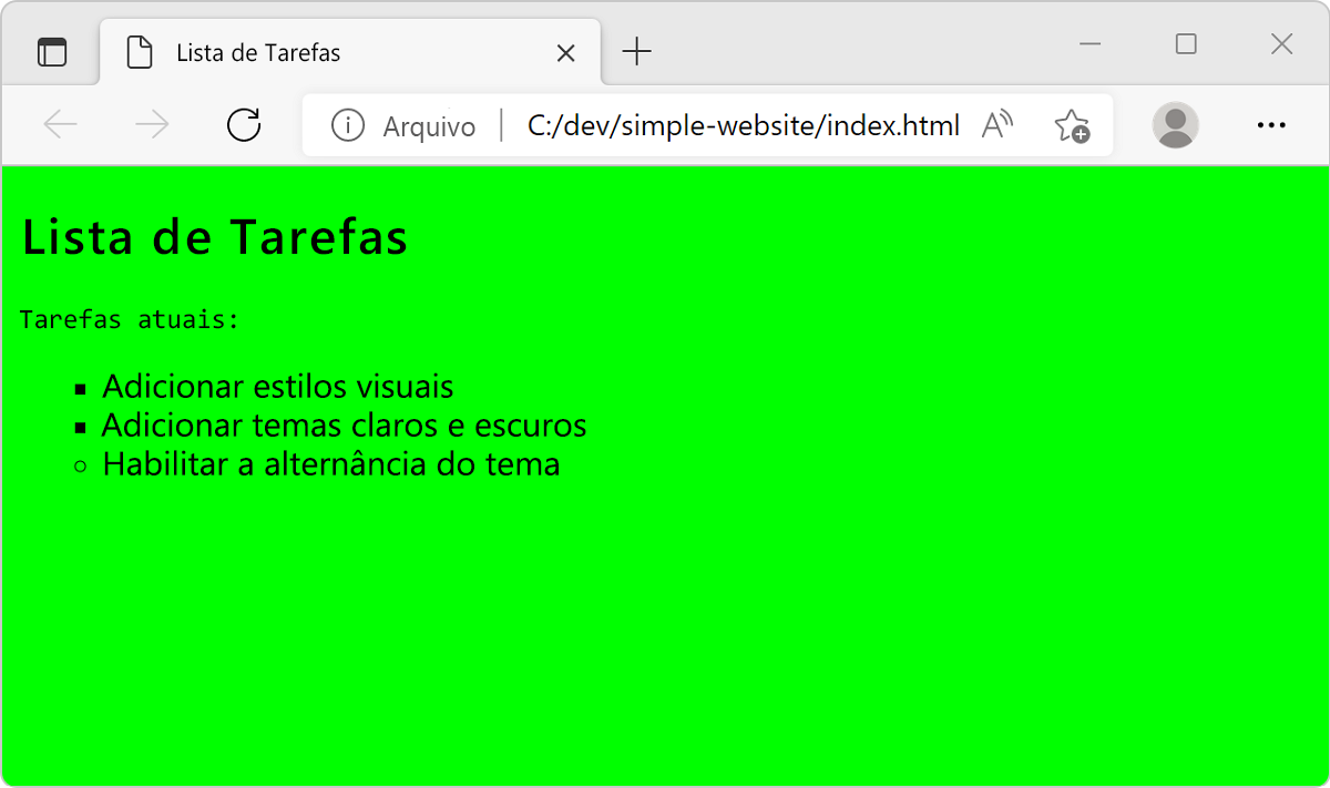 main.css) agora deve se parecer com este exemplo::root { --green: #00FF00; --white: #FFFFFF; --black: #000000; } body { background: var(--bg); color: var(--fontColor); font-family: helvetica; } li { list-style: circle; } .list { list-style: square; } .light-theme { --bg: var(--green); --fontColor: var(--black); } .dark-theme { --bg: var(--black); --fontColor: var(--green); }Para exibir o tema escuro, abra o arquivo
