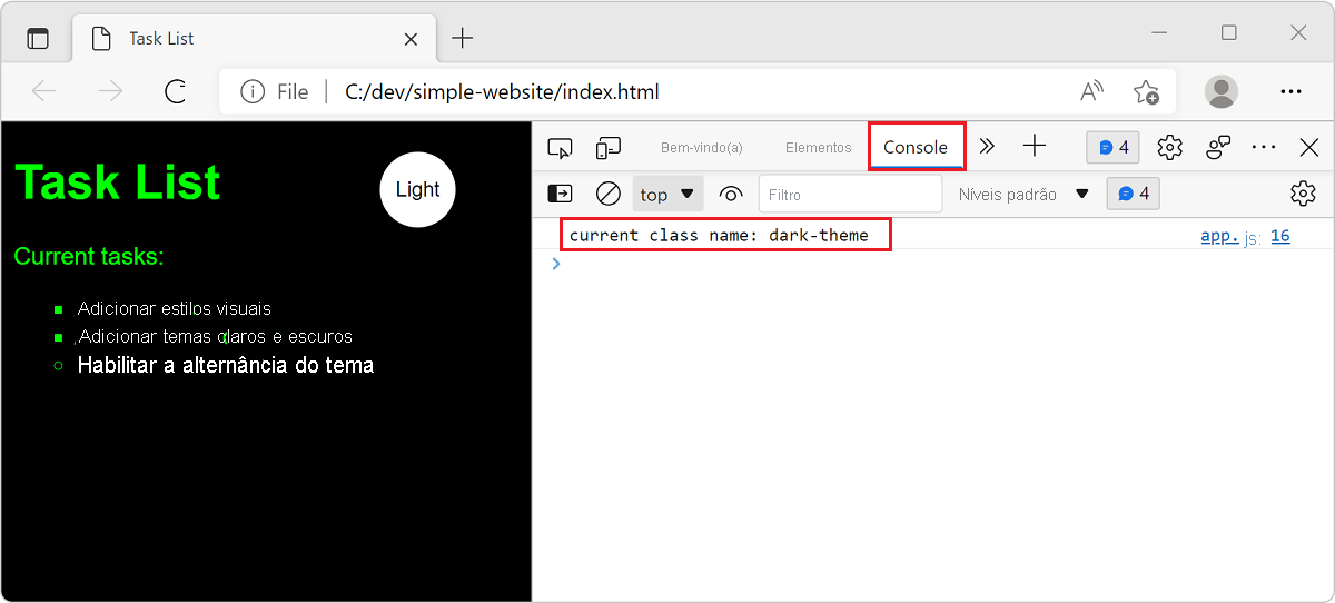 <script>app.jsarquivo, conforme mostrado no exemplo a seguir. Certifique-se de que ele está localizado após o elemento de fechamento</ul>da lista.... <ul> <li class="list">Add visual styles</li> <li class="list">Add light and dark themes</li> <li>Enable switching the theme</li> </ul> <script src="app.js"></script> ...