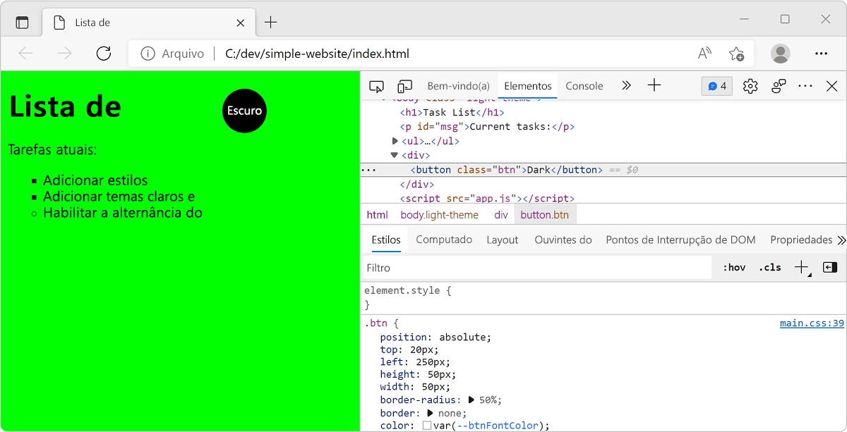 index.html), adicione um<button>elemento . Coloque o botão dentro de um<div>elemento e adicione-o logo após o final da lista (</ul>).... <ul> <li class="list">Add visual styles</li> <li class="list">Add light and dark themes</li> <li>Enable switching the theme</li> </ul> <div> <button class="btn">Dark</button> </div> <script src="app.js"></script> ...Observe que o