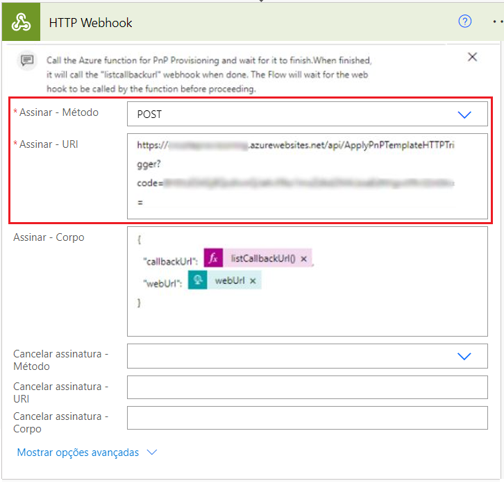 Para conectar o URI ao conector Webhook HTTP, você usará as opções Método de Assinatura e Autenticação de Assinatura. As mesmas etapas são necessárias para cancelar a assinatura.