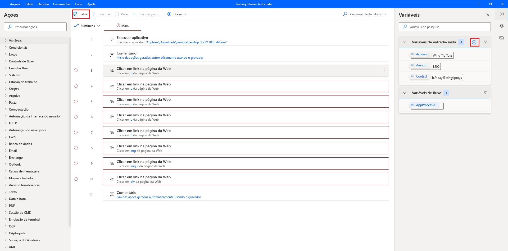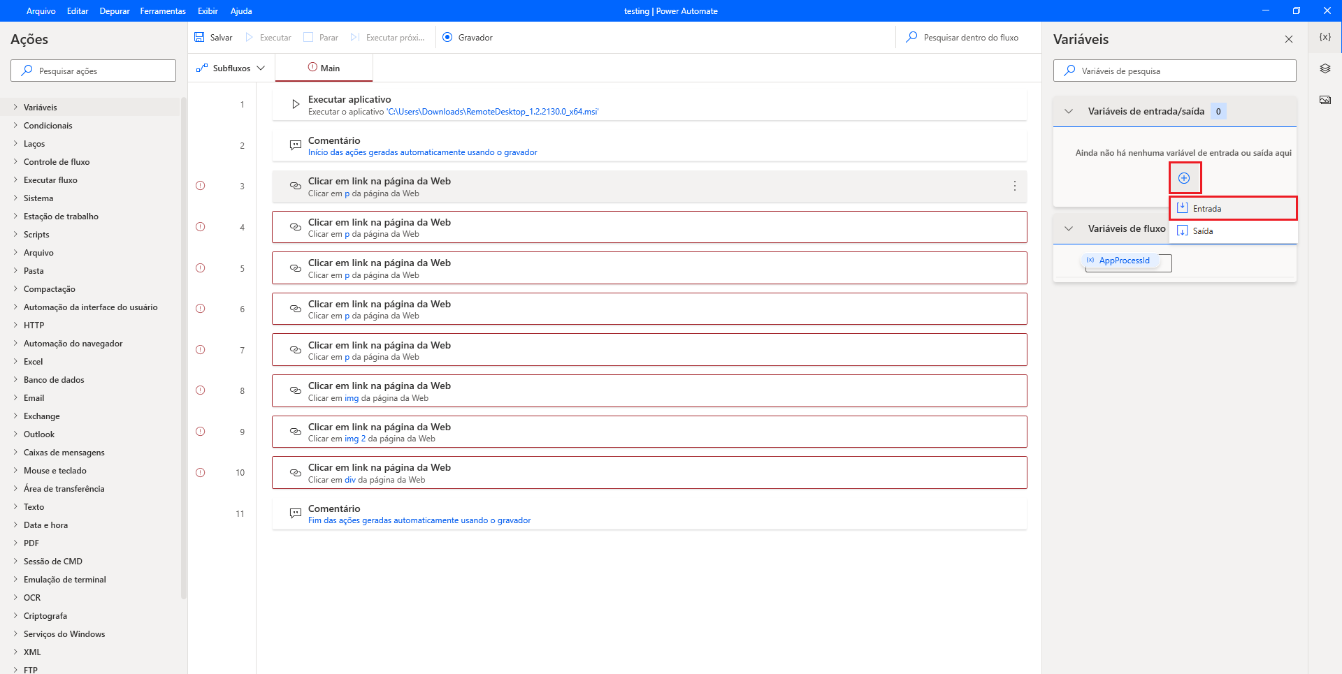 Agora que você definiu as variáveis de entrada, é possível definir como elas serão usadas no fluxo da área de trabalho.