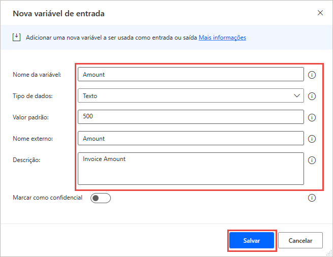 Após concluir a definição das variáveis de entrada, selecione Salvar.