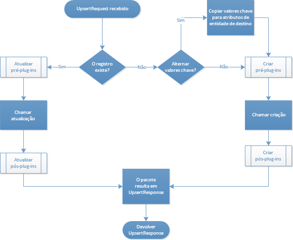 Em vez de consultar primeiro e depois escolher entre Criar ou Atualizar, você pode enviar uma mensagem Upsert. Quando usado com uma chave alternativa, o Dataverse determinará automaticamente se deve criar uma linha ou atualizar uma existente.