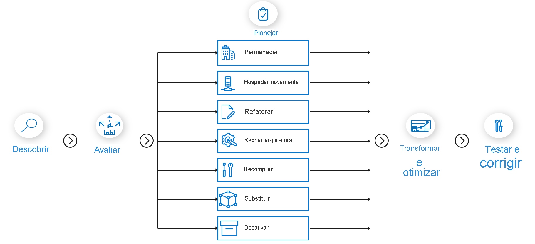 Na fase de planejamento do processo de modernização da plataforma de dados, há sete termos para descrever como você pode lidar com a transição de aplicativos e dados de um ambiente local existente para um novo ambiente baseado em nuvem (público ou privado):