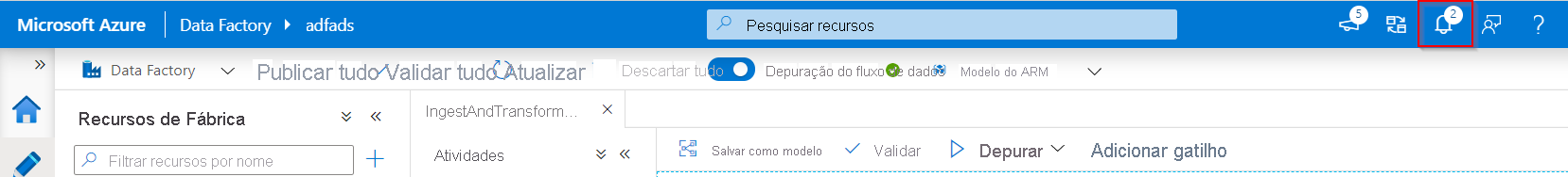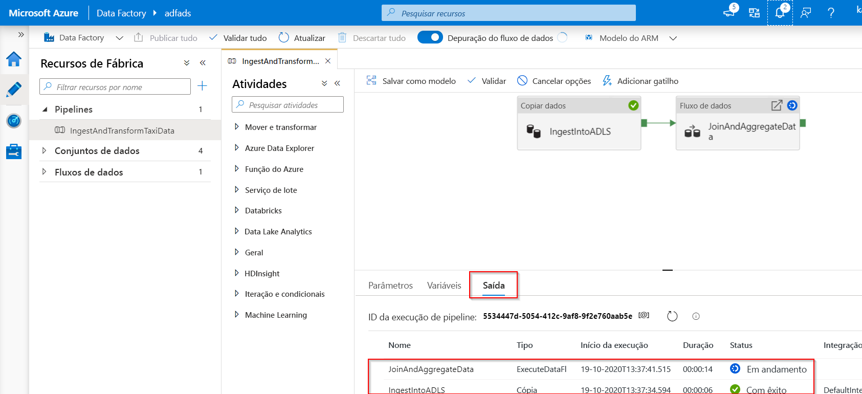 Para depurar o pipeline, selecione Depurar na barra de ferramentas. Verá o estado da execução do pipeline no separador Saída, na parte inferior da janela.