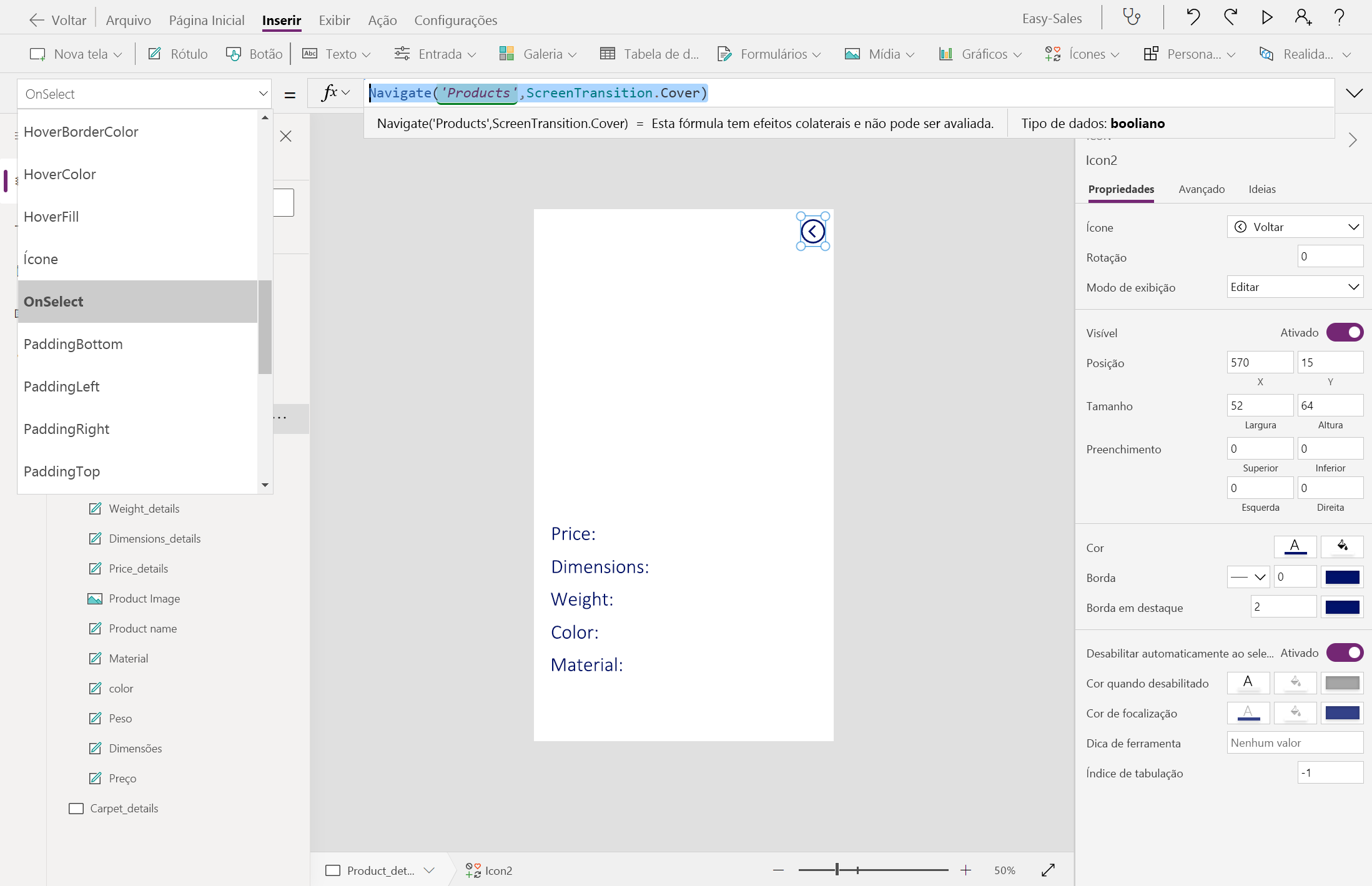 2. Selecione o > ícone no controle de galeria incluído na página Produtos e na página Tapetes . Em seguida, configure a propriedade OnSelect adicionando as seguintes linhas na guia Funções , respectivamente.