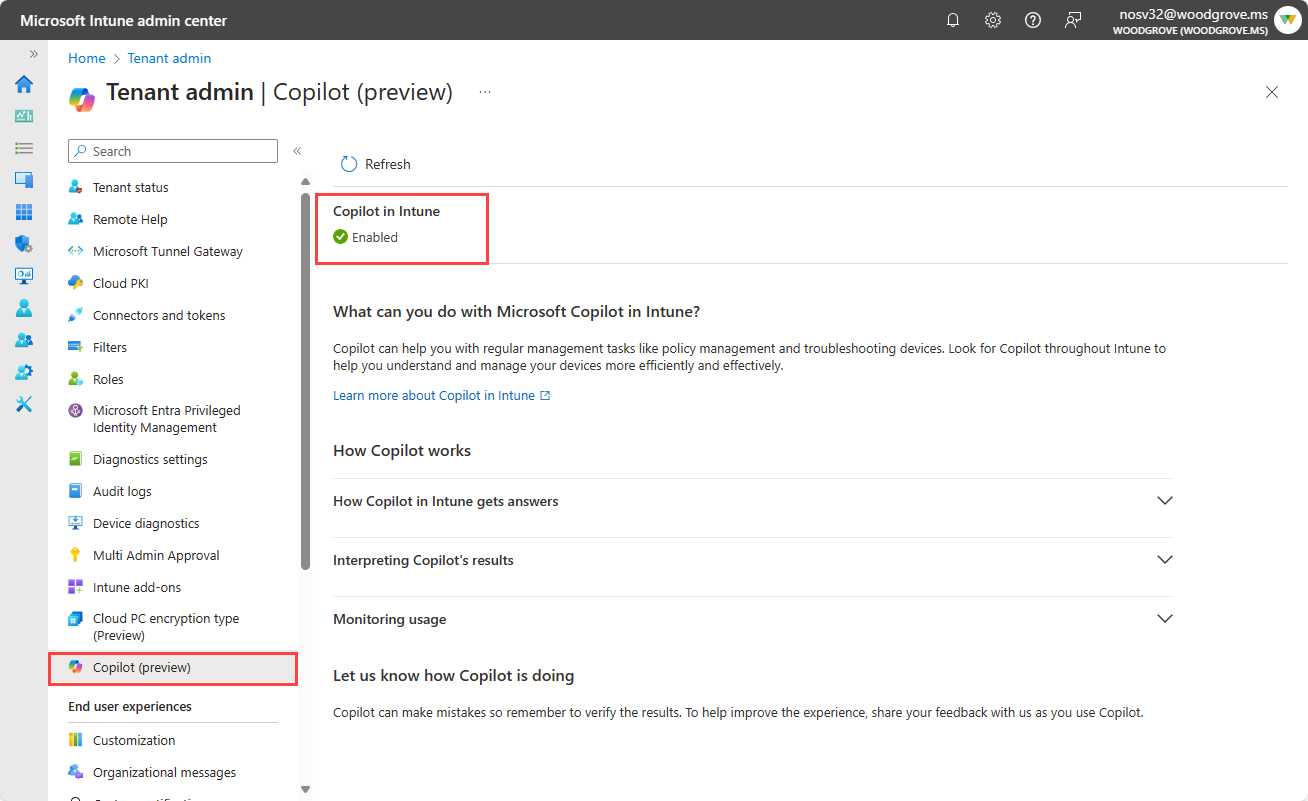 Pode verificar o estado do Copilot no Intune a partir do centro de administração do Intune.