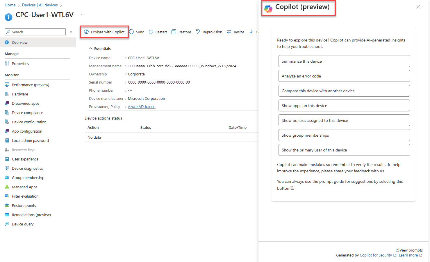 Você pode usar o Copilot para obter informações específicas do dispositivo, como os aplicativos instalados, a associação ao grupo e outras informações que podem ajudar a solucionar problemas de um dispositivo.