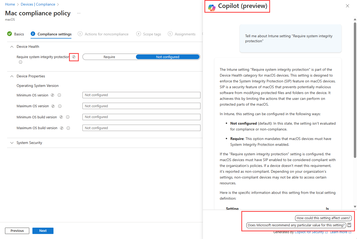 O exemplo a seguir mostra a guia de configurações de conformidade para uma nova política de conformidade do macOS. Ao lado de cada configuração há um ícone do Copilot. Selecionar o ícone Copilot exibe informações detalhadas sobre a configuração.