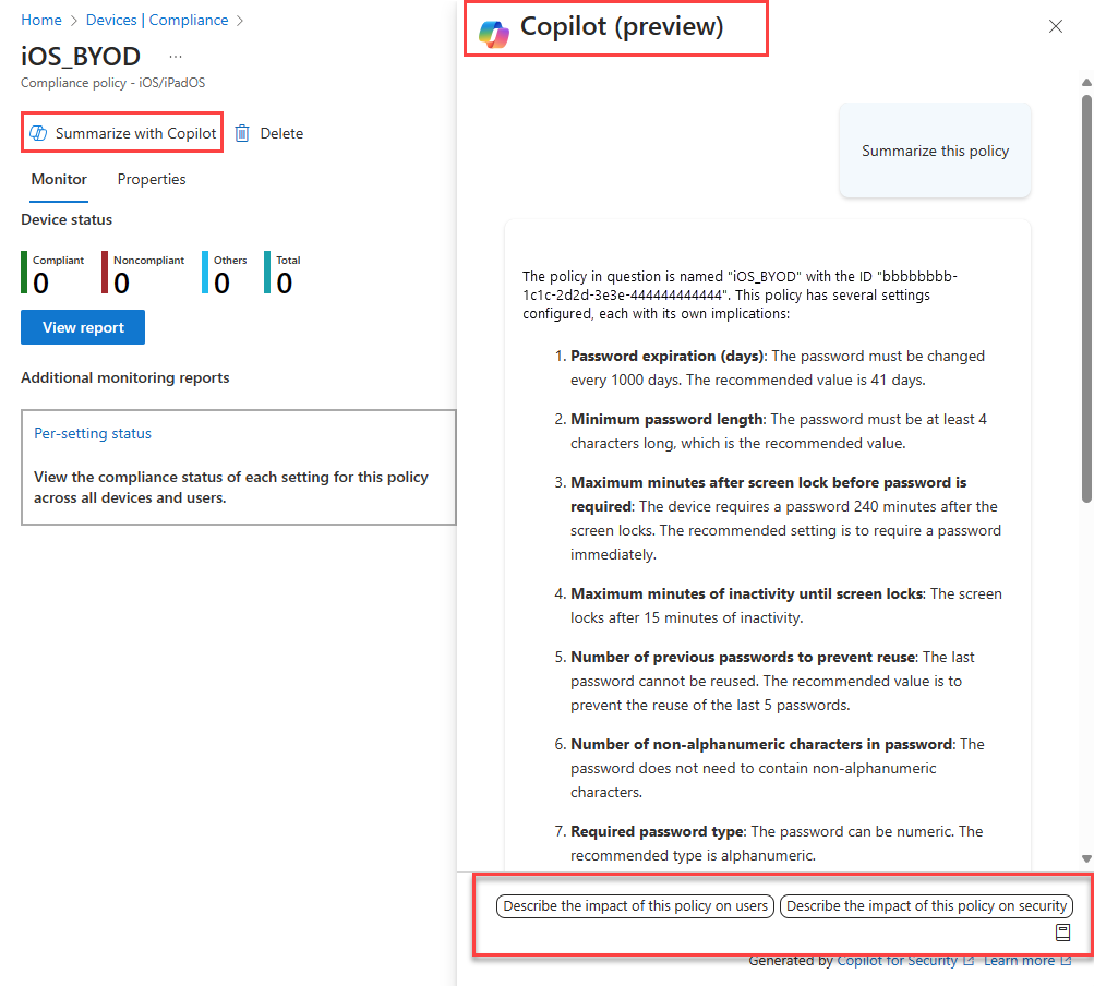 A partir de uma política existente, você pode usar o Copilot para resumir a política. O resumo descreve o que a política faz, os usuários e grupos atribuídos à política e as configurações na política. Esse recurso pode ajudá-lo a entender o impacto de uma política e suas configurações em seus usuários e dispositivos.