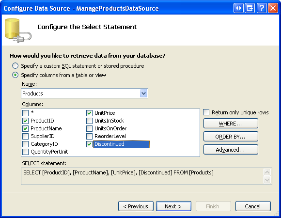 From the Configure Data Source wizard, opt to use the NORTHWINDConnectionString connection string and click Next. From the Configure the Select Statement screen, leave the Specify columns from a table or view radio button selected and pick the Products table from the drop-down list. Select the ProductID, ProductName, UnitPrice, and Discontinued columns from the checkbox list.
