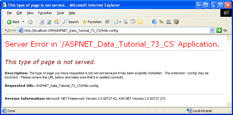 Since Web.config may contain sensitive data such as connection strings, it is important that the contents of Web.config be kept safe and hidden from unauthorized viewers. By default, any HTTP request to a file with the .config extension is handled by the ASP.NET engine, which returns the This type of page is not served message shown in Figure 1. This means that visitors cannot view your Web.config file s contents by simply entering http://www.YourServer.com/Web.config into their browser s Address bar.