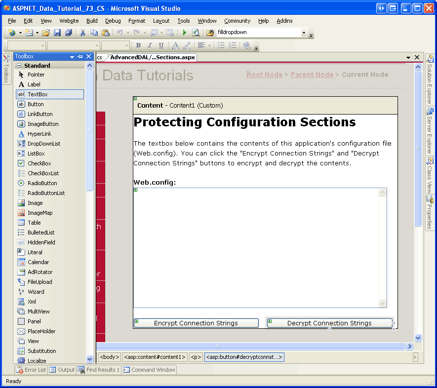 Start by opening the EncryptingConfigSections.aspx page in the AdvancedDAL folder. Drag a TextBox control from the Toolbox onto the Designer, setting its ID property to WebConfigContents, its TextMode property to MultiLine, and its Width and Rows properties to 95% and 15, respectively. This TextBox control will display the contents of Web.config allowing us to quickly see if the contents are encrypted or not. Of course, in a real application you would never want to display the contents of Web.config.