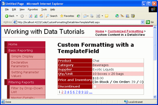 The same TemplateFields capabilities available with the GridView are also available with the DetailsView control. In this tutorial we'll display one product at a time using a DetailsView that contains two TemplateFields. The first TemplateField will combine the UnitPrice, UnitsInStock, and UnitsOnOrder data fields into one DetailsView row. The second TemplateField will display the value of the Discontinued field, but will use a formatting method to display "YES" if Discontinued is true, and "NO" otherwise.