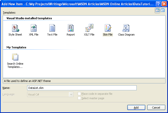 Figure 10: Create a New Skin File Named DataList.skin (Click to view full-size image)