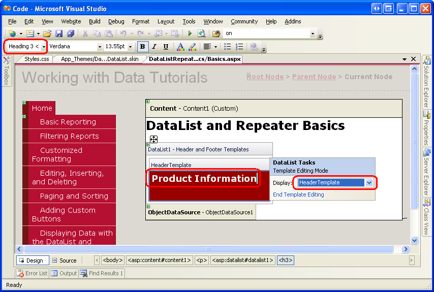 Step 1: Adding the DataList and Repeater Tutorial Web Pages