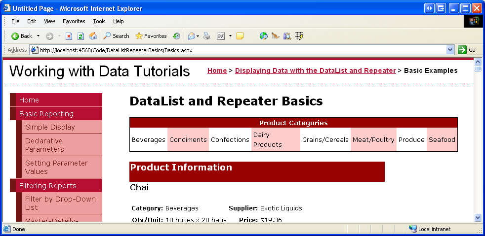 Over the next dozen or so tutorials, we'll look at building common reporting patterns with the DataList and Repeater controls, starting with the basics of displaying data with these controls templates. We'll see how to format these controls, how to alter the layout of data source records in the DataList, common master/details scenarios, ways to edit and delete data, how to page through records, and so on.