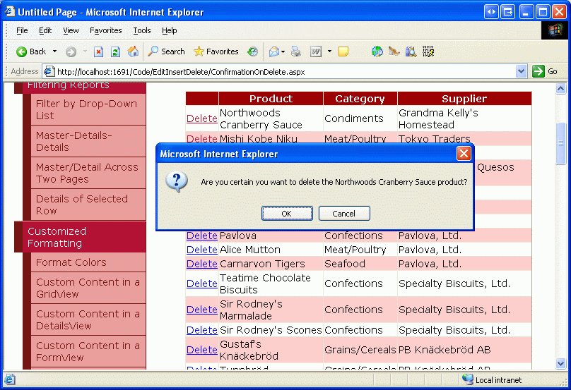 With these changes complete, clicking on a Delete button in the GridView displays a customized confirmation dialog box (see Figure 4). As with the confirmation messagebox from the FormView, if the user clicks Cancel the postback is cancelled, thereby preventing the deletion from occurring.