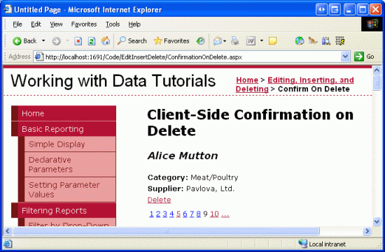 While this user interface enables visitors to delete records through the GridView, DetailsView, or FormView controls, it lacks any sort of confirmation when the user clicks the Delete button. If a user accidentally clicks the Delete button when they meant to click Edit, the record they meant to update will instead be deleted. To help prevent this, in this tutorial we'll add a client-side confirmation dialog box that appears when the Delete button is clicked.