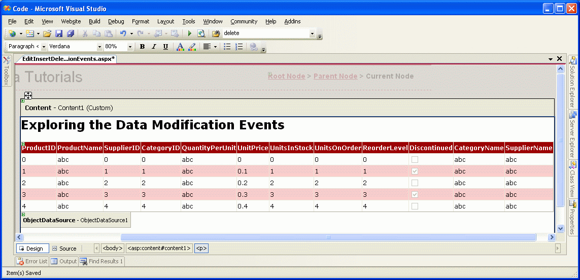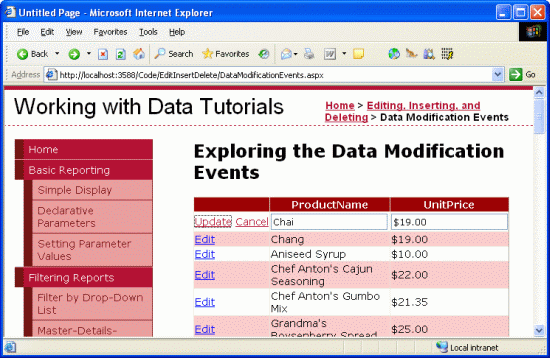 In this tutorial we'll examine using these events to extend the built-in inserting, updating, and deleting capabilities of the ASP.NET data Web controls. We'll also see how to customize the editing interface to only update a subset of the product fields.