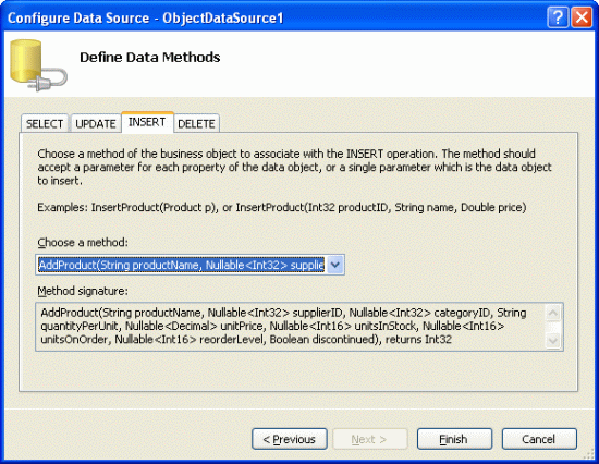 To configure the ObjectDataSource, select the Configure Data Source link from its smart tag, launching the wizard. The first screen allows you to change the underlying object the ObjectDataSource is bound to; leave it set to ProductsBLL. The next screen lists the mappings from the ObjectDataSource's methods to the underlying object's. Even though we explicitly indicated that the Insert() and Delete() methods should not be mapped to any methods, if you go to the INSERT and DELETE tabs you'll see that a mapping is there. This is because the ProductsBLL's AddProduct and DeleteProduct methods use the DataObjectMethodAttribute attribute to indicate that they are the default methods for Insert() and Delete(), respectively. Hence, the ObjectDataSource wizard selects these each time you run the wizard unless there's some other value explicitly specified.