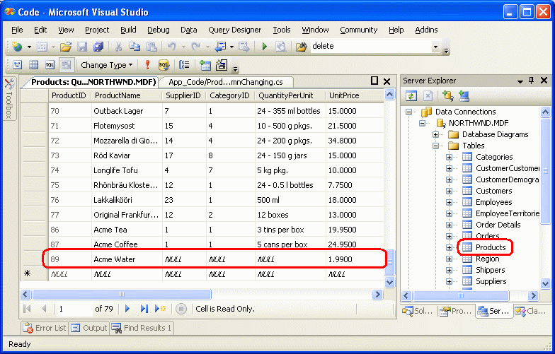 While the GridView in Figure 18 doesn't show it, the product fields lacking from the DetailsView interface CategoryID, SupplierID, QuantityPerUnit, and so on are assigned NULL database values. You can see this by performing the following steps: