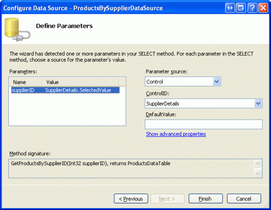 Figure 8: Use the Suppliers DropDownList as the supplierID Parameter Source (Click to view full-size image)