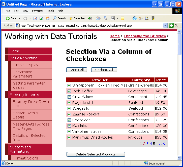 In this tutorial we will see how to add a column of checkboxes and how to determine what checkboxes were checked on postback. In particular, we'll build an example that closely mimics the web-based email client user interface. Our example will include a paged GridView listing the products in the Products database table with a checkbox in each row (see Figure 1). A Delete Selected Products button, when clicked, will delete those products selected.