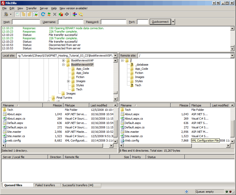 Figure 1 shows FileZilla after the necessary files have been copied. FileZilla displays the files on the local computer on the left and the files on the remote computer on the right. As Figure 1 shows, the ASP.NET source code files, such as About.aspx.cs, are on the local computer (the development environment) but were not copied to the web host provider (the production environment) because code files do not need to be deployed when using explicit compilation.