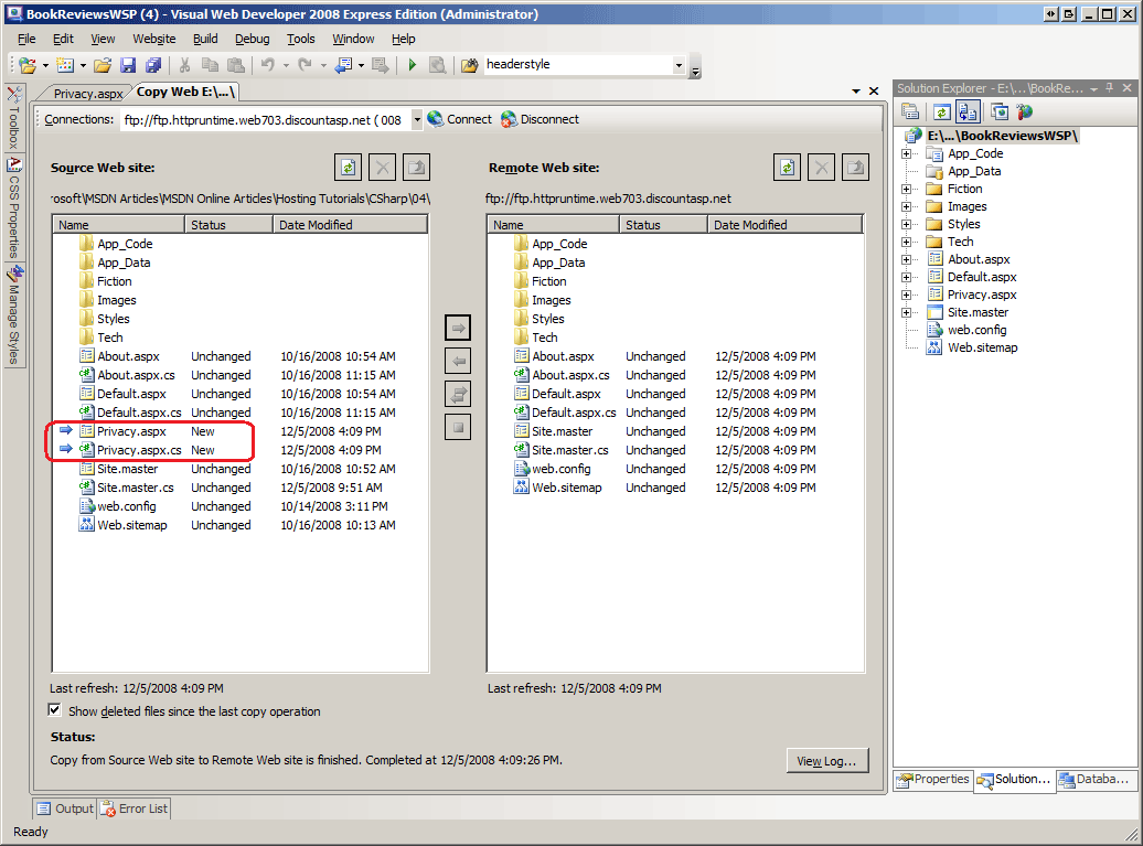 Figure 4: The Copy Web Site Tool Includes the New Privacy.aspx Page in its Left Pane (Click to view full-size image)