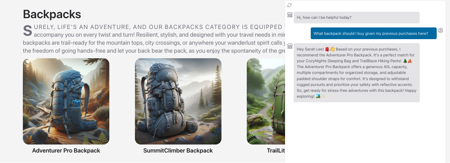 This template implements Contoso Outdoors, a conceptual store specializing in outdoor gear for hiking and camping enthusiasts. This virtual store enhances customer engagement and sales support through an intelligent chat agent. This agent is powered by the Retrieval Augmented Generation (RAG) pattern within the Microsoft Azure AI Stack, enriched with Semantic Kernel and Prompty support.
