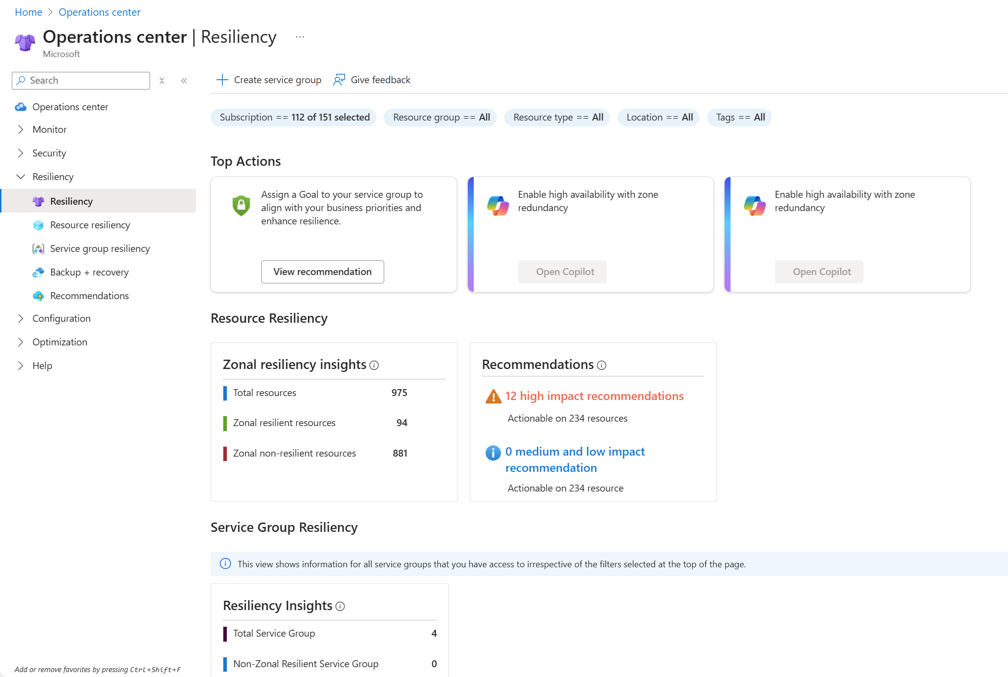 | Service group resiliency | Listing of all service groups in your subscriptions identifying the resiliency status of the resources in each group. Assign resiliency goals to each |