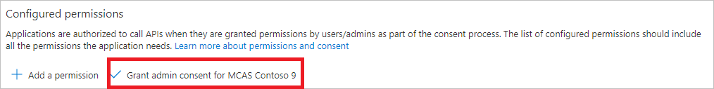 On your application page, select API Permissions > Add permission > APIs my organization uses > type Microsoft Cloud App Security and then select Microsoft Cloud App Security.