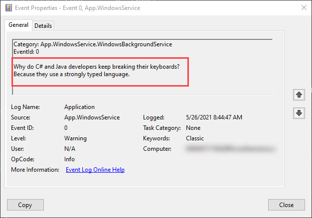 After seeing logs in the Event Log, you should stop the service. It's designed to log a random joke once per minute. This is intentional behavior but is not practical for production services.