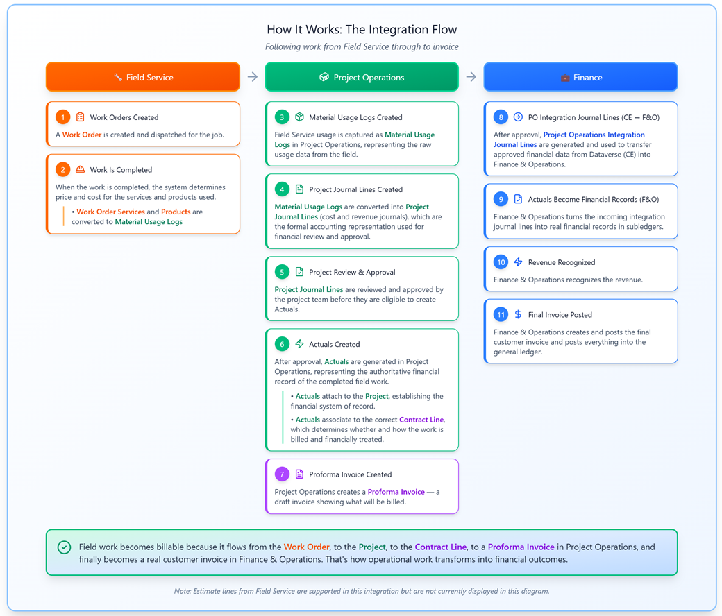 Conexiunea dintre Dynamics 365 Field Service și Project Operations rezolvă această problemă folosind un singur model comun pentru a înțelege și procesa munca de servicii. Forța de muncă, materialele și executarea serviciilor capturate în Field Service trec acum printr-un singur motor financiar pentru o contabilizare și facturare consecventă. Această abordare unificată reduce efortul de reconciliere, întărește vizibilitatea în domeniul serviciilor și al activităților orientate pe proiecte și permite rezultate financiare și operaționale mai previzibile.