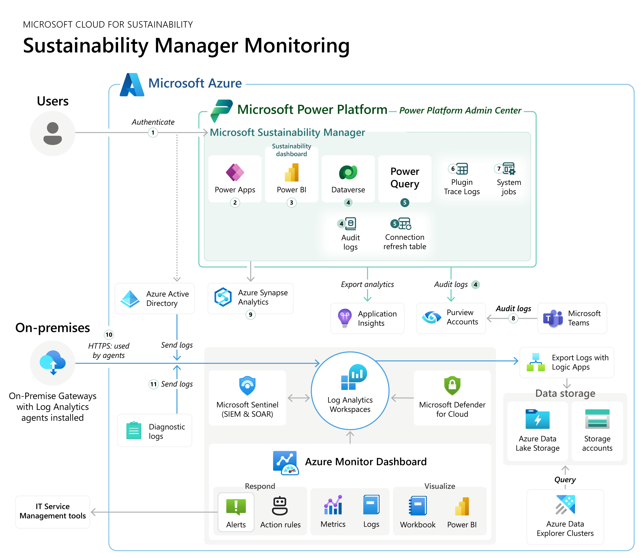 | 1 | Autentificare la Sustainability Manager | Microsoft Entra Jurnalele de conectare cu ID sau jurnalele de activitate trimise către Azure Monitor | Conectarea, furnizarea și auditarea jurnalelor în Microsoft Entra ID | Modificări ale aplicațiilor, grupurilor, utilizatorilor și licențelor în Microsoft Entra jurnalele de audit | Alerte particularizate Azure Monitor SIEM: Microsoft Sentinel Securitate cibernetică: Microsoft Defender |